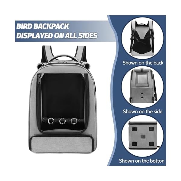 [BREATHABLE AND PERSPECTIVE DESIGN]:The Breathe and Perspective Bird Backpack is perfect for travel and hiking,as it is ventilated on three sides and has a transparent window for a great view of the scenery.The backpack is also breathable and has a comfortable fit,so your bird will be able to enjoy the trip with you.