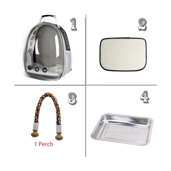 Package includes 1 bird backpack + 1 stainless steel tray + 1 velvet lined soft mat + 1 Cotton rope perch.