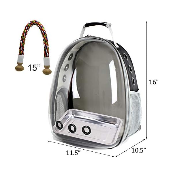See-through Bubble Bird Carrier Backpack: Space capsule liked bird travel backpack, pet safe transparent hard shell protects your bird better. Great bird travel backpack with stand perch and tray included.