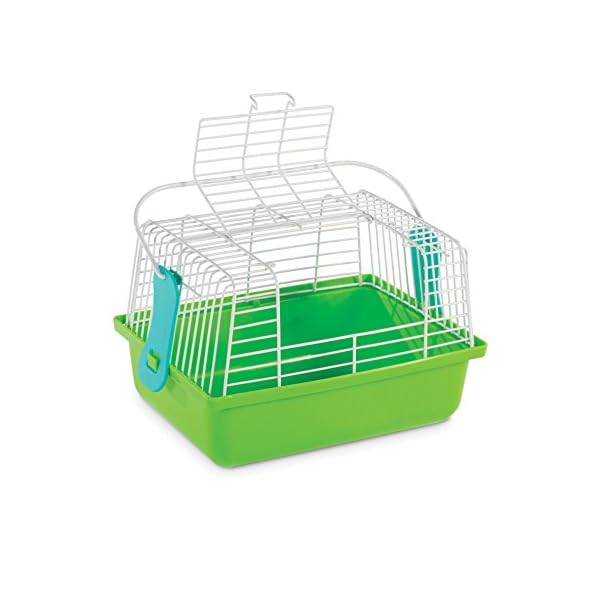 Prevue Pet Products Travel Cage for Birds and Small Animals Green SP1304GREEN is a compact carrying cage for your small bird or small animal. Ideal for temporary use when traveling brief distances with your pet, included perch is designed for small birds and can be removed for transporting small animals such as hamsters or gerbils. Large top opening door is large enough to fit your hand in the cage and turquoise clips secure the wire mesh to the plastic base. With a convenient carrying handle, our Green Travel Cage for Birds and Small Animals measures 9 Long, 5 5/8 Wide and 6 1/8 High with 3/8 wire spacing. Base alone is 2 7/8 deep.Warnings :Inspect the product periodically and remove from use if it becomes worn or damaged