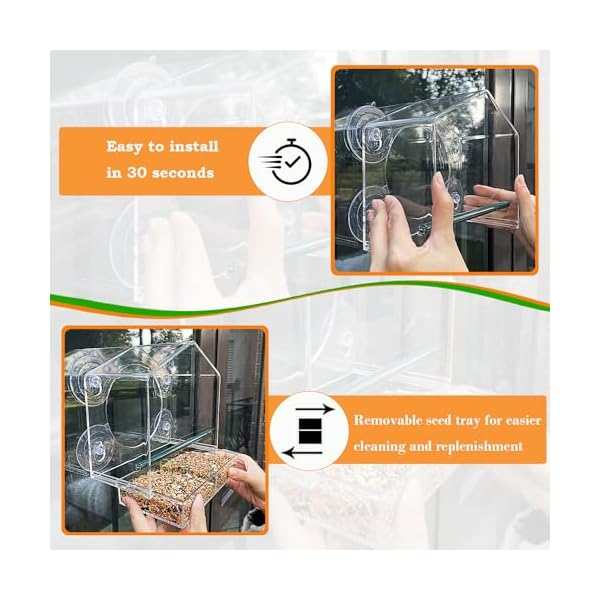 BIRD FEEDER WINDOW: Removable tray for easy cleaning, the sloping roof and drainage holes on the feeding pan protect the seeds from getting wet in rain and snow, making them strong enough to withstand all kinds of weather.