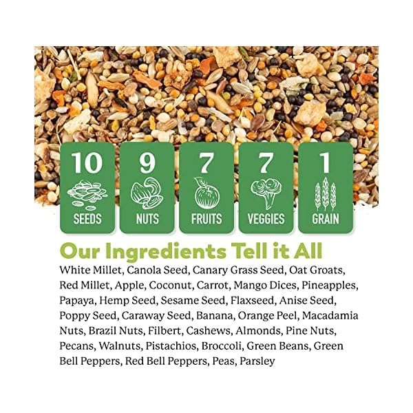 Packed with a variety of foods that parakeets need to have a balanced diet, including 10 types of seeds and millet, 9 types of nuts, 14 types of fruits and vegetables, and oat groats