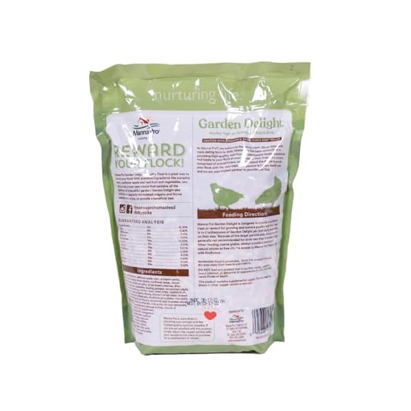 Manna Pro Garden Delightâ„¢ Poultry Treat is a great way to reward your flock! With premium ingredients like pumpkin seeds, sunflower seeds and real fruit and vegetables, you can provide a treat year-round that contains all the goodness of a bountiful garden! Garden Delight also includes our specially formulated oregano and thyme natural herb pellets, to provide a beneficial zest.