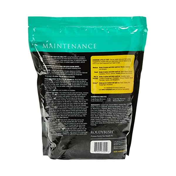Daily Maintenance, Specially steam-pelleted food designed to retain beneficial nutrients while eliminating harmful bacteria. Give your birds the nutrition they need with no artificial colors or flavors and no animal by-products. Contains 11-Percent protein, 7-Percent fat. Use for pet birds year-round and for off-season breeding birds. No additional vitamins or mineral supplements needed. Please specify Nibbles, Crumbles, Mini Pellets, Small Pellets, Medium Pellets, or Large Pellets.