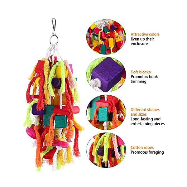 Parrot Essential Toy: The bird toy provides essential physical activity to keep your feather friends stable and happy, and improve your health. If your parrot enjoy spending time undoing the knots and dismantling the toy, this toy is one of the best choice for you. This product is colorful, well-made, durable, with many pieces of wood and cotton knots, which satiates their natural urge to chew.