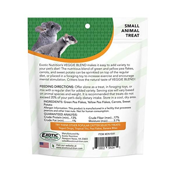 Exotic Nutrition’s Veggie Blend makes it easy to add variety to your pet’s diet! FEATURES:✔ HEALTHY – Nutritious blend of green and yellow pea flakes, carrots, and sweet potato ideal for Chinchillas, Rabbits, Guinea Pigs, Prairie Dogs, Degus, and other herbivores✔ FORAGING – Can be placed in a foraging toy to increase exercise and encourage mental stimulation. ✔ NUTRITIOUS – Great source of dietary fiber, protein, potassium, and vitamins C, A, and E✔ EASY TO FEED – Offer alone or sprinkle on top of favorite foods✔ VARIETY – Lends variety to an otherwise monotonous diet✔ DENTAL HEALTH – Provides good exercise for teeth and jaws✔ ENRICHMENT – Adds behavioral enrichment for animals that spend their lives in a small, limited environment. ✔ BONDING – Forms a connection between pets and pet owners, assisting in bonding and training.INGREDIENTS: Green Pea Flakes, Yellow Pea Flakes, Carrots, Sweet PotatoGUARANTEED ANALYSIS: Crude Protein (min) 13%, Crude Fiber (max) 17%, Crude Fat (min) 1.0%, Moisture (max) 3.7%FEEDING DIRECTIONS: Offer alone as a treat, in foraging toys, or mix with a regular diet for added variety. Serving size will vary based on animal species and weight.This product is a treat and should be fed sparingly, it is not a substitute for a regular, balanced diet. Offer treats 2-3 times per week or as a small portion (less than 10%) of the main diet. Treats may lead to health issues like obesity when overfed. If your pet is not consuming its regular balanced diet, withhold serving treats until stable eating habits resume.