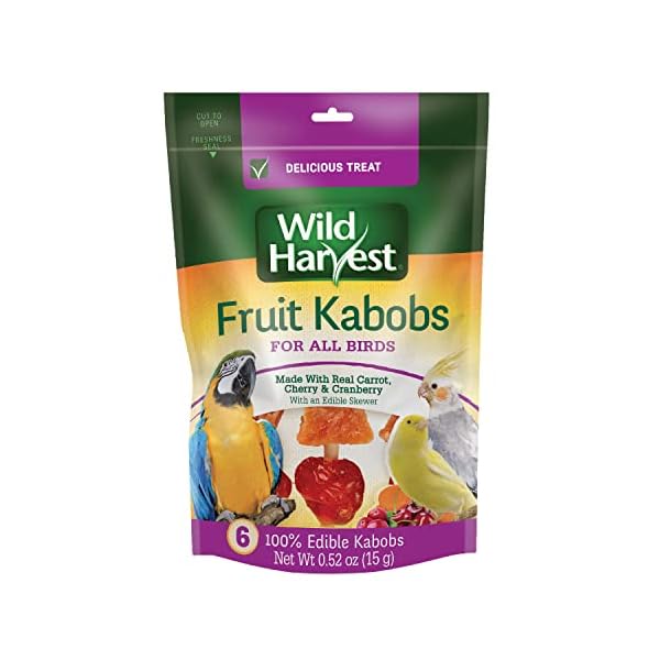 Wild Harvest brand is dedicated to providing products that promote balanced nutrition for birds and small animals. A full range of nutrition and interactive products provides your pets with the nutrients, vitamins and minerals they need for a healthy, happy life. Wild Harvest Fruit Kabobs make for a delicious treat for all birds. These 100% edible kabobs include an edible skewer and are made with real carrot, cherry and cranberry. You can add variety to your feathered friend’s daily diet with this tasty treat. Plus, the resealable bag helps keep fruit kabobs fresh. Intended for intermittent or supplemental feeding only. Kabobs can be fed as a special treat or reward. Offer a single kabob per serving and remember to have fresh water readily available. Not intended as sole source of nutrition. Store in a dry place for maximum freshness.