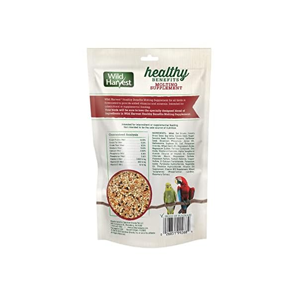 Wild Harvest brand is dedicated to providing products that promote balanced nutrition for birds and small animals. A full range of nutrition and interactive products provides your pets with the nutrients, vitamins and minerals they need for a healthy, happy life. Wild Harvest Healthy Benefits Molting Supplement supports colorful and healthy plumage for all birds. This molting supplement is formulated to provide added vitamins and minerals to your pet’s diet. Your feathered friend will surely love the specially designed blend of ingredients, including millet, oat groats and canary grass seed. Intended for intermittent or supplemental feeding. Not intended to be the sole source of nutrition.