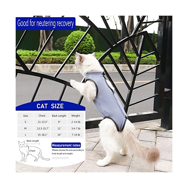2. 【Size】: S: Weight 2-3.4 lb and Back Length 9″, M: Weight 3.4-7 lb and Back Length 11″, L: Weight 7-14 lb and Back Length 14″ for the cat onesie for cats after surgery