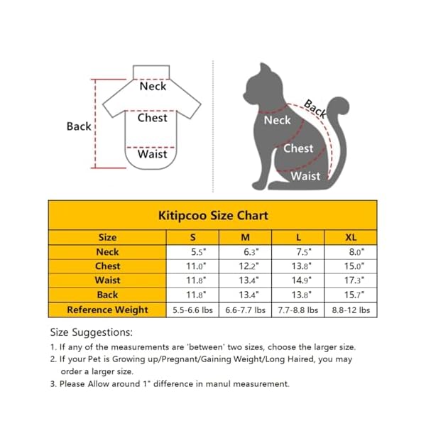 【Measures】Attention: All these Size suggestions are for Hairless Cat Only. Size S for 5.5-6.6 lbs. Size M for 6.8-7.7 lbs. Size L for 8-8.8 lbs. Size XL for 9-12 lbs. If Your cats are NOT hairless but like our shirts, Please order one size Larger. More Size information please refer to the size chart below.
