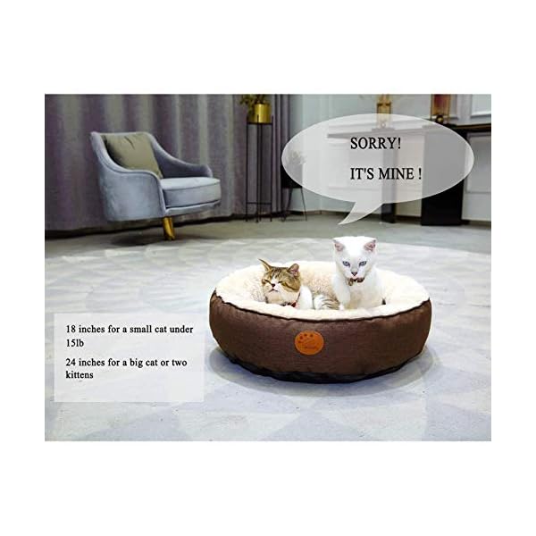 SUPPORTIVE HEAD & NECK REST: This calming cat bed boasts a soft trim on the inside, a donut shape with warm fur, and a surrounding bolster that cradles our friend’s head and neck. Filled with 1.3lb polyester for the 20-inch medium cat bed and 2.2lb for the 24-inch large dog bed, it offers excellent support for our pet’s head, neck, and body.