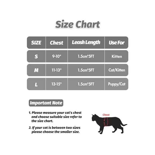 😺EASY ON/EASY OFF – Our cat leashes and harnesses for walking comes in 3 sizes, please make sure your cat’s chest and neck fit a size of chart before placing an order. Simply run their front legs through and snap the top on. The “step into” style is way easier to “install” than those that require putting the head through an opening, and is also less stressful for the cat.