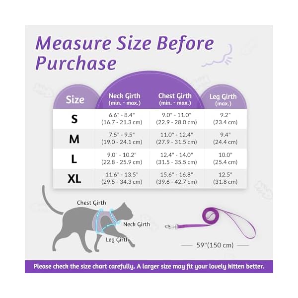 Fits Perfectly: Neck Girth: 6.6″ – 8.4″(16.7 – 21.3cm), chest Girth: 9.0″-11.0″( 22.9 – 28.0cm) Please accurately measure your cat and carefully select a harness by referring to the size chart. For a better fit for your adorable kitty, it is suggested that you choose a larger size. Package includes: 1 * cat harness & 1 * nylon leash (59 inch)
