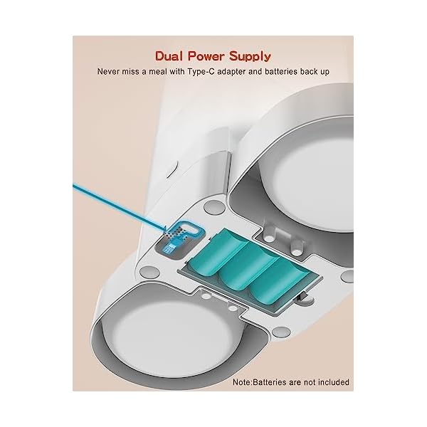 [Dual Power Supply ] The timed cats feeder can be powered by USB power adapter and 3 alkaline D-size batteries (NOT Included). Once the feeding schedule is set, it is repeated every day. In the event of a power outage, the automatic feeder will automatically switch to battery power. For safety reasons, it is recommended to use Battery power sources. Battery alone can supply power for 200 days.No need to worry about your pet going hungry while you are away.