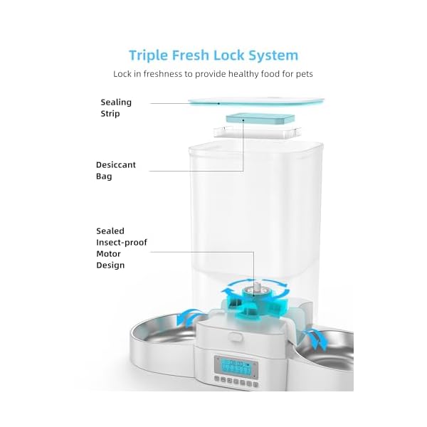 [Multiple Sealing Keeps Food Fresh] The rubber seal between the lid and the container of the automatic feeder effectively insulates the air to prevent the food from oxidizing and prevents the smell of your pet’s food from escaping. There is also a desiccant bag on the lid to dehumidify and prevent moisture. The unique sealed revolving door design in the feeder automatically closes the feeding port after each feeding is completed, preventing ants and insects from entering