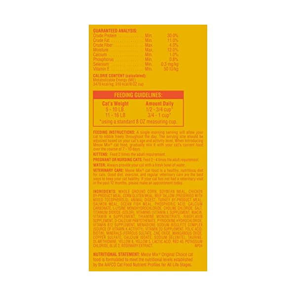 Meow Mix Original Choice Dry Cat Food is specially formulated to help adult cats stay healthy and happy. This dry food for cats is the perfect mix to help you connect with your cat over a healthy meal. To maintain wellness throughout adulthood, fully grown cats need the proper nutrition to keep them in top shape as they age. Meow Mix Original Choice provides all the essential nutrients your cat needs, including high-quality premium protein and essential fatty acids to help support strong muscles and keep their coat looking its best. This dry cat food blend is packed with tons of wholesome ingredients and the irresistible flavors of chicken, turkey, salmon and ocean fish. This tasty dry food for cats is 100% complete and balanced nutrition for adult cats with all the vitamins and minerals they need for optimal health. Even for the pickiest of kitties, happiness starts here with a Meow Mix Original Choice Dry Cat Food mealtime — they ask for it by name!