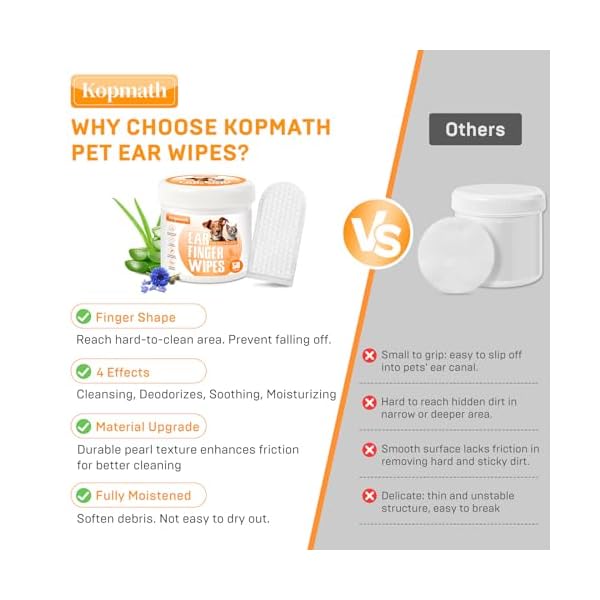 Gently Clean and Deodorize Pet’s Ears. Kopmath dog ear wipes are designed to effectively clean earwax, dirt and discharge deeper inside the ears without causing any discomfort. Regular use can stop ear itching. Perfect for pets who refuse any ear cleansing or those who hates ear drops and cotton swab.