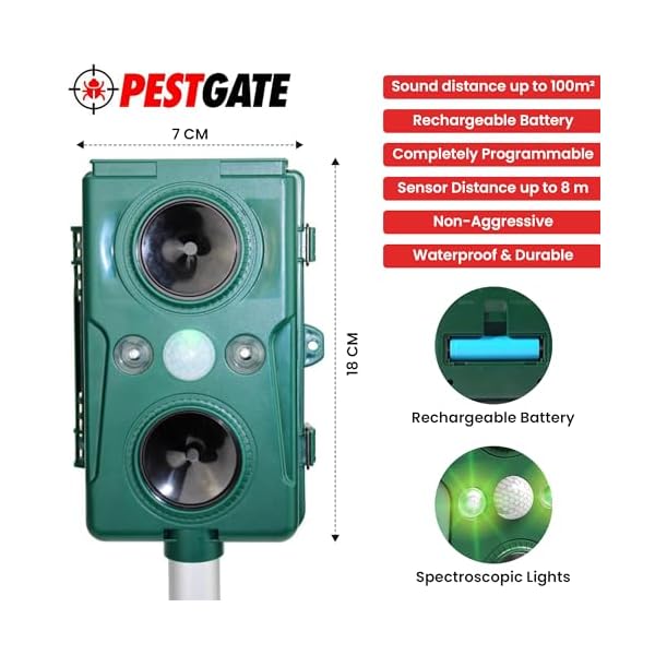 Ultrasonic Pest Repeller – Motion Sensor, Outdoor Cat Repellent, Ultrasonic Animal Repellent, Rechargeable Solar, Ultrasound and Sonic Waves, Flashing Light, Waterproof & Non-Aggressive