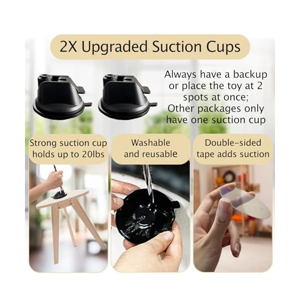 [Extra Suction] Our package comes with TWO suction cups, so you can always have a backup or place the toy at multiple spots at once. The strong suction cups can withstand 20+ lbs and stick securely to any smooth surface such as walls, windows, tables, or floors. *Note that suction may be weaker on grained surfaces.* The double-sided tape adds suction on rougher surfaces while preventing glue marks.