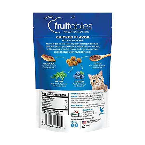 FLAVORFUL SUPERFOODS – Made with real chicken and tasty superfoods. Fruitables Cat treats are made with savory protein flavors that your cat will love, combined with the goodness of nutrient-rich superfoods of flaxseed, pea fiber, blueberry and chicken