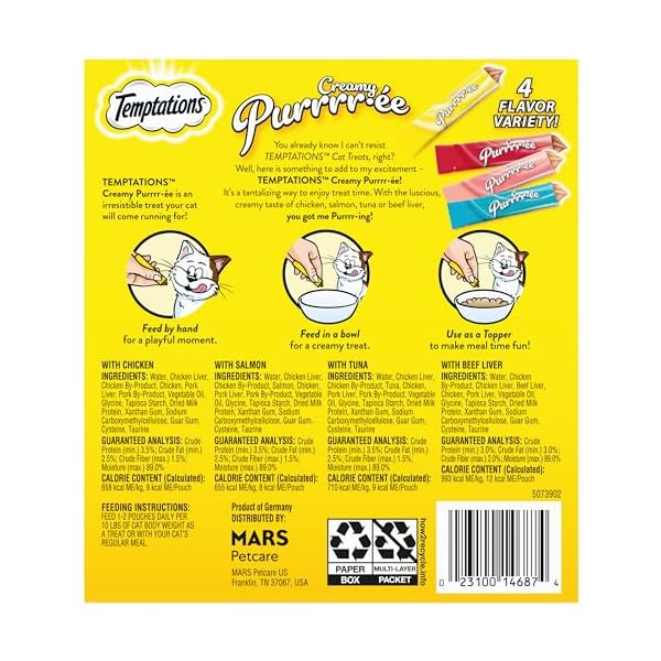 Contains forty-eight (48) total pouches: Twelve (12) 0.42 oz pouches of TEMPTATIONS Creamy Puree with Beef Liver Lickable Cat Treats, Twelve (12) 0.42 oz pouches of TEMPTATIONS Creamy Puree with Salmon Lickable Cat Treats, Twelve (12) 0.42 oz pouches of TEMPTATIONS Creamy Puree with Chicken Lickable Cat Treats, and Twelve (12) 0.42 oz pouches of TEMPTATIONS Creamy Puree with Tuna Lickable Cat Treats