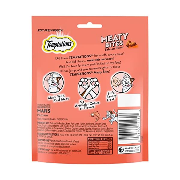 Contains one (1) 4.12 oz. pouch of TEMPTATIONS Meaty Bites Cat Treats, Salmon Flavor