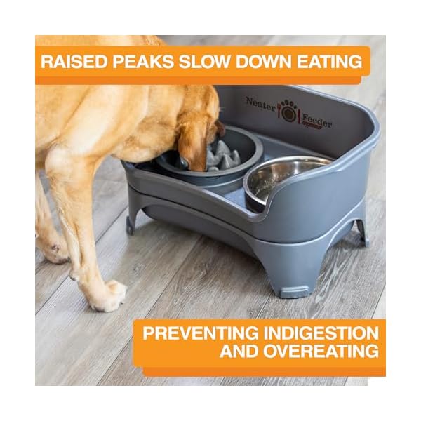 FITS INSIDE OF LARGE NEATER FEEDERS: Insertable slow feed bowl can be used inside of the Neater Feeder Express Medium to Large size, Neater Feeder Deluxe Large size, and most other 2-quart raised pet bowl holders. The Niner holds up to 2 cups of food comfortably (for best results, do not overfill) and measures 8.38” across the top, 7.43” at the base, and 2.44” tall.