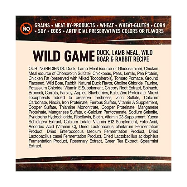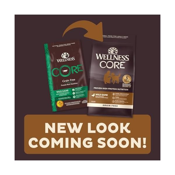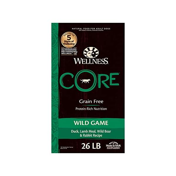 Wellness CORE Natural Grain Free Dry Dog Food Wild Game Duck, Lamb Meal, Wild Boar & Rabbit Recipe is healthy, 100% natural grain free dog food for adult dogs made with high-protein duck, lamb, turkey, wild boar and rabbit, plus easy-to-digest legumes to help support your dog’s optimal health and fortified with antioxidents, probiotics, vitamins and minerals, including fish and flax omega blend for healthy skin and coat. Wellness CORE grain free dog food formulas are based on the nutritional philosophy that dogs thrive on a diet mainly comprised of meat. Each grain free, nutrient-rich formula provides high quality protein for your dog with no meat by-products or fillers, grain, corn, soy, wheat-gluten or artificial preservatives, colors or flavors.