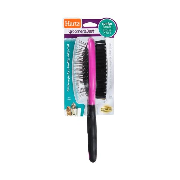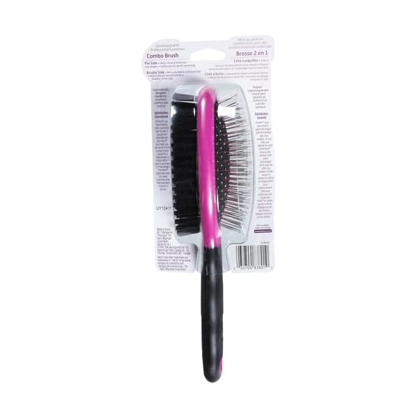 Features two brushes and grooming actions in one! One side contains stainless steel tips with a protective coating to remove lose hair and detangle coat; the other side has dense nylon bristles to redistribute natural oils for a healthy, shiny coat