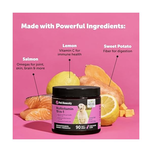 MADE WITH PROBIOTICS, GLUCOSAMINE, & OMEGA-3S: Multivitamin 10-in-1 chews are filled with health-supporting ingredients you can trust. Probiotics promote a healthy gut and the absorption of essential vitamins & nutrients. Glucosamine, when combined with chondroitin, can promote healthy joints. Omega-3s support joint, skin + coat, & heart health.