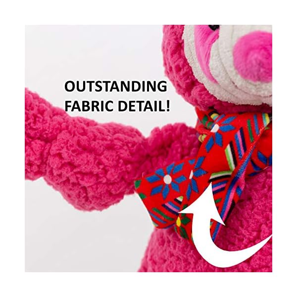 Knotties are the most durable plush dog toys available, made for dogs and puppies. Made with exclusive Tuffut Technology, a durable two-layer lining on the inside, soft and cuddly on the outside. Natural tugging instincts are satisfied by the soft fabric, knots in the limbs and 5 squeakers. Knotties promote healthy exercise and mental stimulation which makes them a hit with owners, dogs, and puppies of all sizes and breeds. The large size is about 15” long, 7” wide and 5” deep. The small size is about 9” long, 4” wide and 3” deep. All HuggleHounds plush toys can be machine washed over and over.
