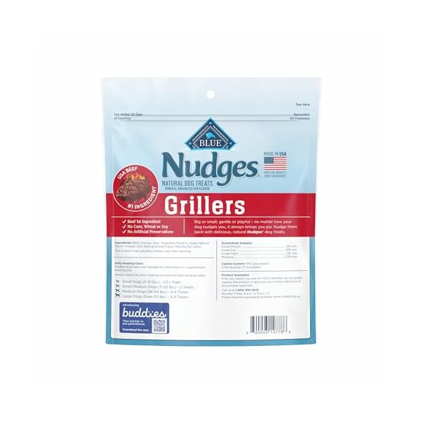 PACKAGING MAY VARY: Contains one (1) 16oz bag of BLUE Nudges Grillers Natural Dog Treats, Steak