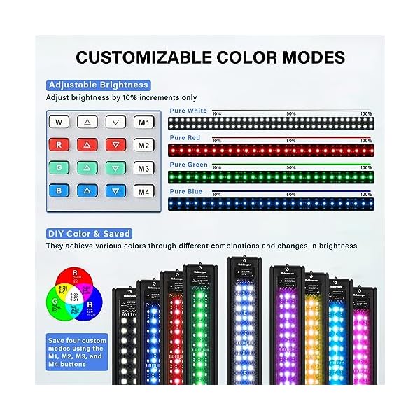 🐟🍀CUSTOMIZABLE COLOR MODES: You can control the middle row of RGB 5050 lamp bead by adjusting the up and down keys of the RGB buttons, these LED beads achieve various color presentations through different combinations and variations of brightness. You can also save four custom modes using the M1, M2, M3, and M4 buttons.