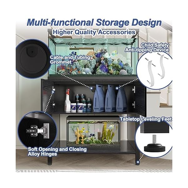 Convenient Storage Cabinet: This aquarium stand is designed with a practical storage cabinet for storing commonly used fish accessories such as fish food, fish nets, gravel cleaner, water conditioner, etc.