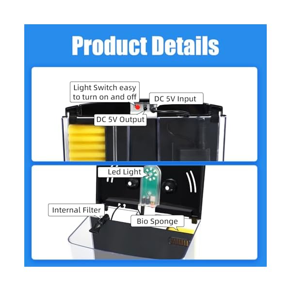 Compact Size: The tank is lightweight, cute and small and it doesn’t take up too much space on the desktop or a kitchen counter. (Note: If the current is a bit strong, you can put a pre-filter sponge filter on the intake to reduce the water flow.)