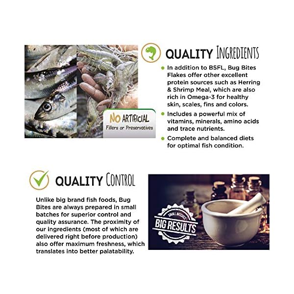 Fluval Bug Bites is a complete fish food that features a unique insect-based formulation, enriched with multiple quality proteins and carbohydrates that are ideal for tropical fish such as bettas, goldfish, cichlids, guppies, and tetras. Insects are hunted by fish in the wild as they offer a widely available food source. The instinctive feeding habit is the foundation behind Bug Bites, which are formulated with nutrient-rich insect larvae and enriched with multiple quality proteins, vitamins, minerals and trace elements. Most freshwater fish are omnivores and regularly feed on insects in the wild. However, not all insects are created equally when it comes to a fish’s diet. Bug Bites are formulated with sustainably harvested Black Soldier Fly Larvae (#1 ingredient across all formulas), which are raised on fruits and vegetables for exceptional “super food” nutrition. Using a unique cultivation process, BSFL are grown under controlled conditions for total sustainability that preserves natural environments. Under controlled conditions, Black Soldier Flies produce larvae, which naturally feed on decaying organic matter. Unconsumed fruits and vegetables are used as larvae feed. The larvae consume the feed, converting the nutrients into protein and healthy fat. After a 2-week feeding cycle, the larvae are harvested and dried. The dried larvae are mixed with other high-quality proteins, vitamins, minerals and trace elements to offer a complete and balanced daily diet. In addition to BSFL, Bug Bites offer other excellent protein sources such as Herring & Shrimp Meal, which are also rich in Omega-3 for healthy skin, scales, fins and colors. Unlike big brand fish foods, Bug Bites are always prepared in small batches for superior control and quality assurance. The proximity of our ingredients (most of which are delivered right before production) also offers maximum freshness, which translates into better palatability.