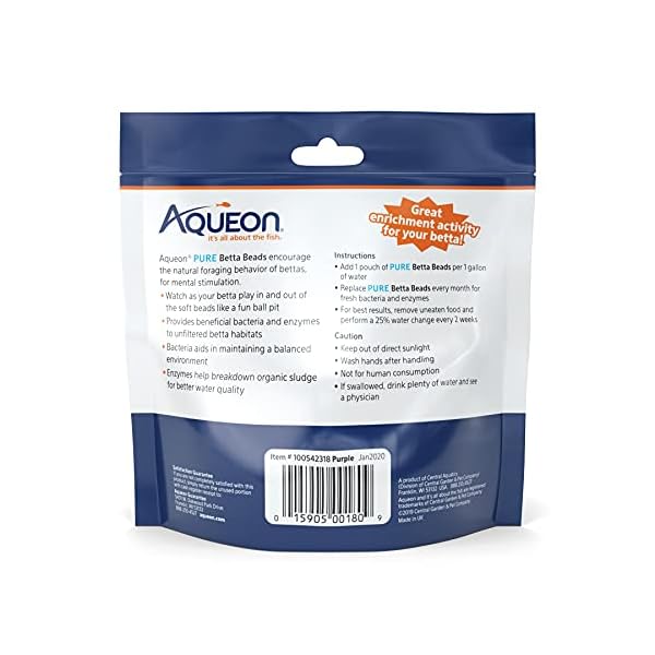 Aqueon PURE Betta Beads contain beneficial bacteria that help maintain a healthy environment in unfiltered aquariums. The beneficial bacteria aids in maintaining a balanced environment while the enzymes help breakdown organic sludge for better water clarity. These soft biodegradable balls create a fun enrichment activity for bettas while also encouraging their natural foraging behavior. Watch your betta play in the beads like a fun ball pit as they dive in and out. Replace the beads monthly and remove uneaten food for optimal results. If betta beads shrink prematurely, this is a quick indicator that the water hardness is not optimal for your betta. We recommend changing the water with soft (deionized or specially filtered) betta waters.