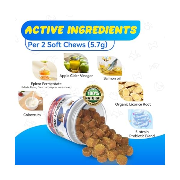 【natural high-quality ingredients】our anti itch bites for dogs are made in the USA with only the highest-quality US and globally sourced ingredients derived from natural sources Include Colostrum, Epicor Fermentate ( Made Using Saccharomyces cerevisiae), Apple Cider Vinegar, Salmon Oil, Organic Licorice Root, 5-strain Probiotic Blendand and a variety of inactive ingredients, contain NO harsh preservatives, corn, soy, GMOs or chemical ingredients.Effective and delicious
