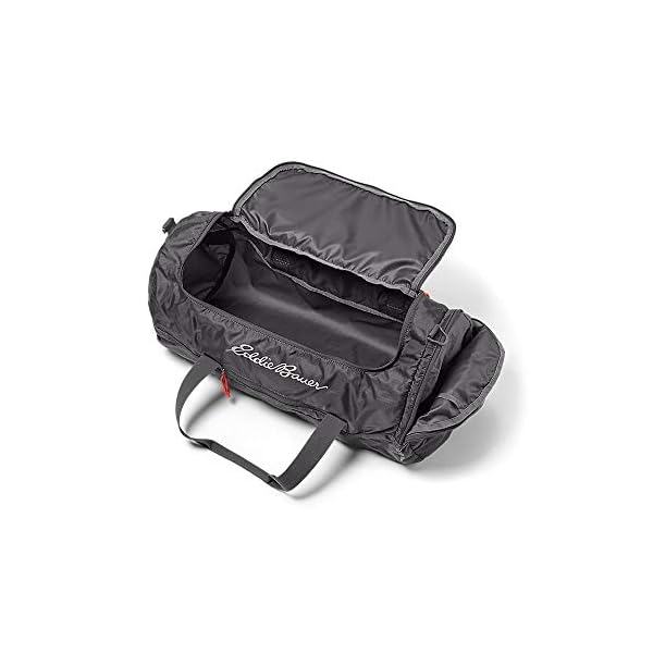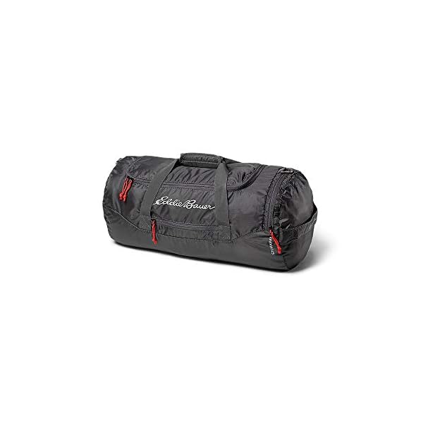 The Eddie Bauer Stowaway Packable 45L Duffel is made with 200-denier ripstop polyester with StormRepel WR finish, making it ultralight and ideal for travel, outdoor adventures or for use as a gym bag. The 45-liter capacity includes a zippered shoe garage and a trolley-handle sleeve for sliding onto your rolling luggage. Packs into one of its end pockets when not in use.