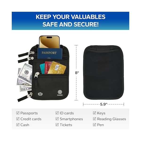 Neck Wallet – Travel Pouch and RFID Blocking Passport Holder for Women and Men, Easy to Conceal Passport Wallet, Slim Travel Wallet to Keep Your Cash, Passport, Cards and Documents Safe (Black)