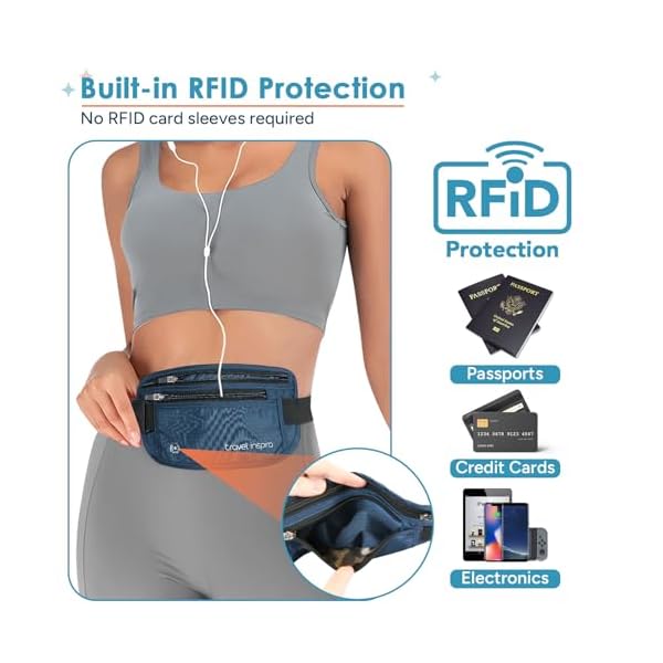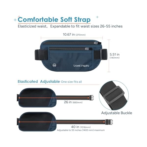 travel inspira RFID Blocking Travel Money Belt with Anti-Thief Zip – Slim Passport Holder and Travel Pouch to Secure Cash, Cards, and Documents (Navy Blue)