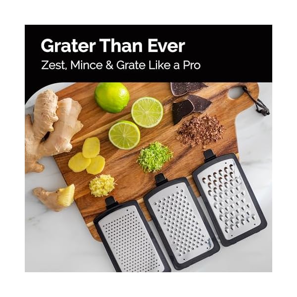 Effortless Blade Switching. This kitchen grater offers 3 different grating surfaces: coarse, medium, and fine. Switching between surfaces is zero-hassle, with no need for multiple different graters. The compact design fits conveniently into drawers and saves you kitchen space.