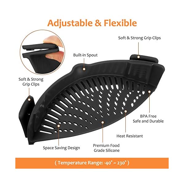 ✎【 DURABLE & HEAT RESISTANT 】 Silicone strainer clip on are made of safe and non-toxic silicone, BPA Free, Dishwasher safe. Silicone Food Strainer can stand the temperatures 230°, and will not break, burn or melt over time